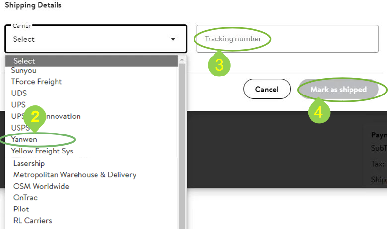 2)标记时,选择YANWEN,且请务必使用燕文推荐的产品单号进行回填(沃尔玛燕文专线快递-普货、沃尔玛燕文专线快递-特货的单号规则为:YW+9位数字+SWW )